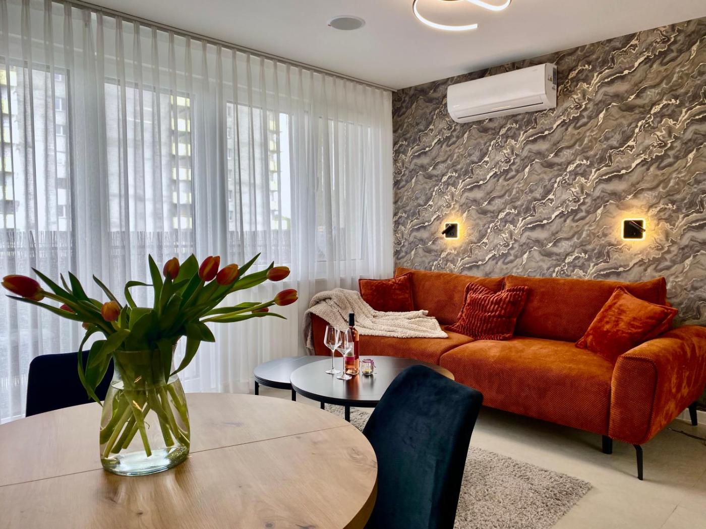 Apartament z 1 sypialnią. The air-conditioned apartment features 1 bedroom, 1 bathroom with a shower and a kitchen. The well-equipped kitchen has a stovetop, a refrigerator, a dishwasher and kitchenware. Featuring a balcony with city views, this apartment also offers a washing machine and a flat-screen TV. The unit offers 1 bed. Apartament - 3 osobowy. Powierzchnia pokoju ok.: 30 mkw.