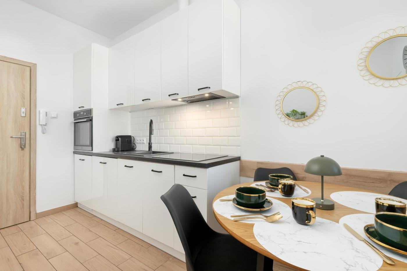 Apartament typu Standard. The apartment has 1 bedroom and 1 bathroom with a shower and free toiletries. In the kitchenette, guests will find a stovetop, a refrigerator, a dishwasher and kitchenware. The apartment features a flat-screen TV with cable channels, a washing machine, a tea and coffee maker, a seating area as well as city views. The unit has 1 bed. Apartament - 3 osobowy. Powierzchnia pokoju ok.: 26 mkw.