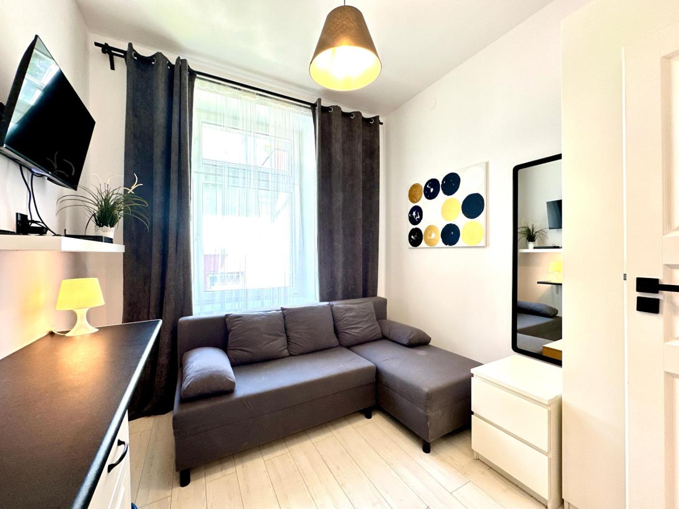 Studio. The studio features a washing machine and a dining area, as well as a private bathroom boasting a shower. In the well-equipped kitchenette, guests will find a stovetop, a refrigerator, kitchenware and an electric kettle. The studio features a flat-screen TV, a wardrobe, a sofa, as well as heating. The unit has 1 bed. Studio - 2 osobowy. Powierzchnia pokoju ok.: 12 mkw.